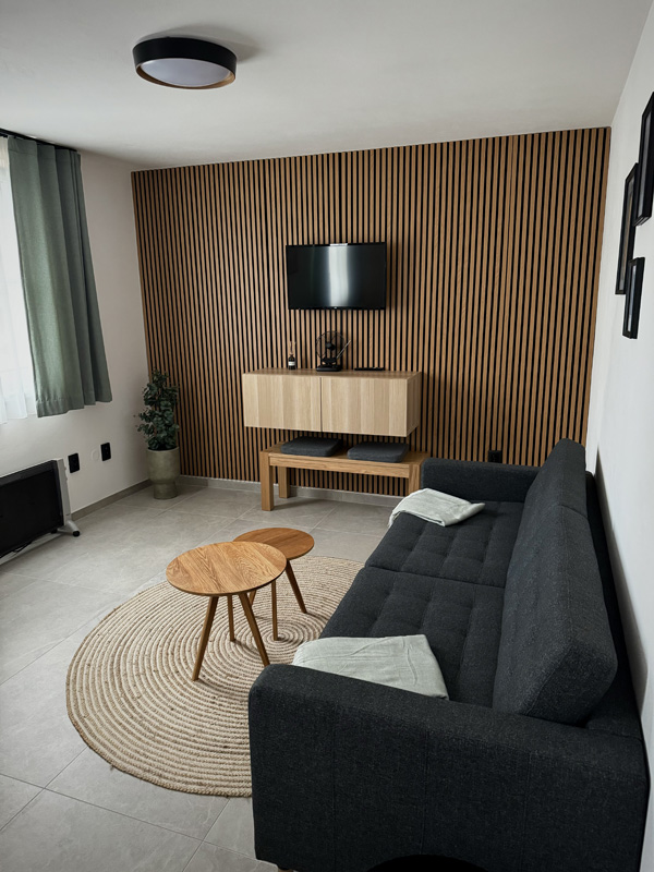 Apartmány jsou plně vybaveny, včetně kuchyňky, lednice a sociálního zařízení. Každý apartmán má jídelní koutek a společenskou místnost s televizí. Za apartmány se nachází útulná terasa s grilem na dřevěné uhlí, který lze volně využívat. Ke každému apartmánu je k dispozici také úschovna kol.